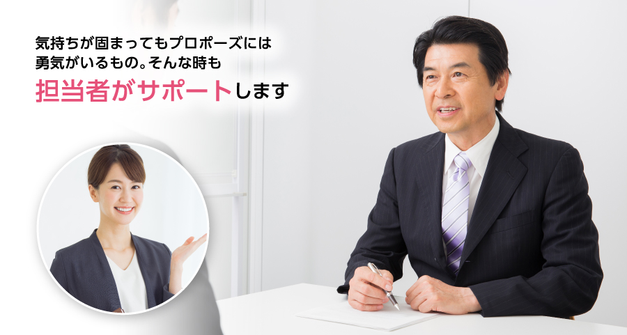 ご家族への紹介タイミングや、プロポーズの場所のことなど最後までしっかりとサポートします。プロポーズ成功のご報告は仲人にとっても一番嬉しい瞬間です。